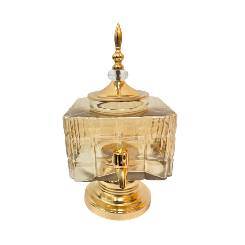 Prabangus kvadrato formos gėrimų dozatorius iš aukštos kokybės stiklo, dekoruotas ryškiais auksiniais akcentais. Reljefinis stiklo raštas suteikia išskirtinumo, o dekoratyvinė dangtelio rankenėlė su kristalo detale – elegancijos. Puikus pasirinkimas šventėms, vaišėms ar stilingam gėrimų pateikimui namuose.