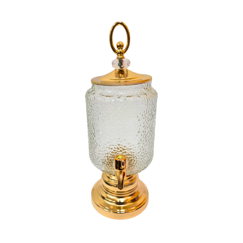 Elegantiško dizaino gėrimų dozatorius, pagamintas iš reljefinio stiklo ir dekoruotas auksiniais elementais. Puikiai tinka vandeniui, limonadui, sultims ar kitiems gėrimams patiekti šventėse, vakarėliuose ar kasdieniam naudojimui.