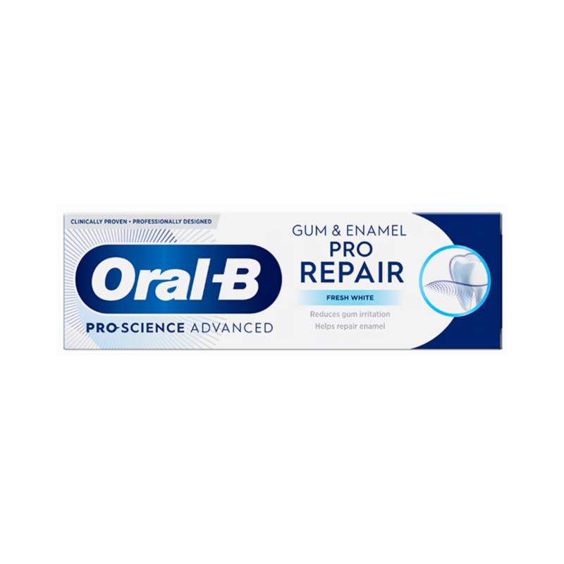 Oral-B Pro-Science Advanced Gum & Enamel Pro Repair Fresh White dantų pasta – pažangi kasdienės burnos priežiūros priemonė, skirta dantenų ir dantų emalio stiprinimui.