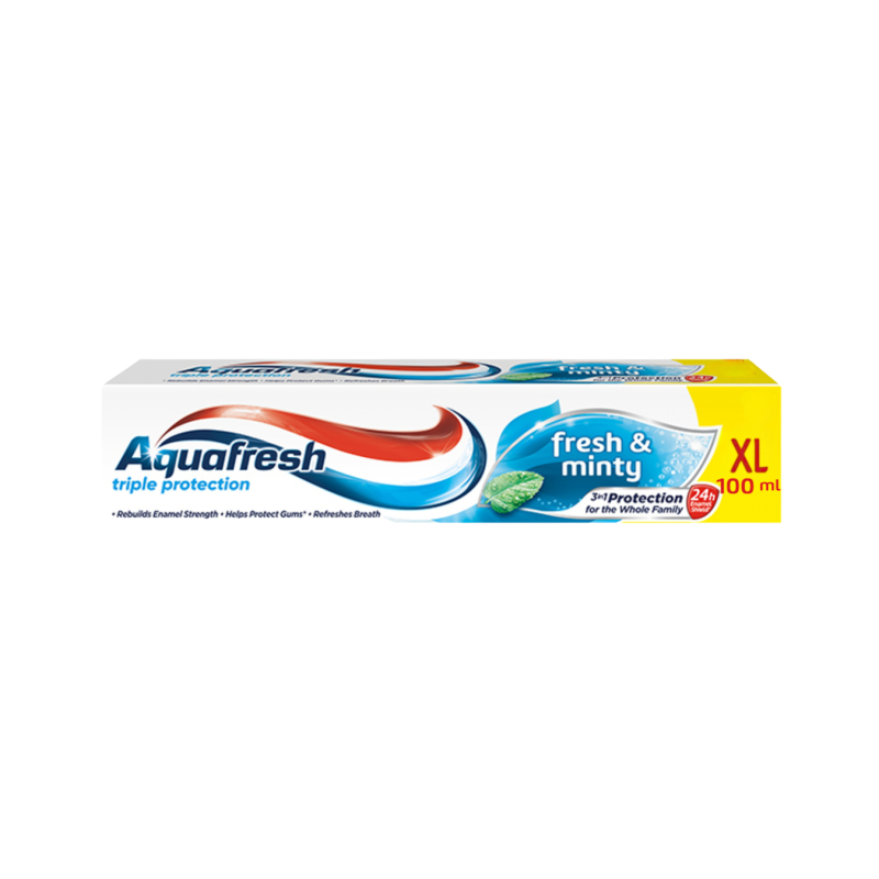 Aquafresh Triple Protection Fresh & Minty dantų pasta – kasdienė burnos higienos priemonė, sukurta visapusiškai dantų ir dantenų priežiūrai. Trigubos apsaugos formulė padeda stiprinti dantų emalį, saugoti dantenas ir gaivinti burnos kvapą.