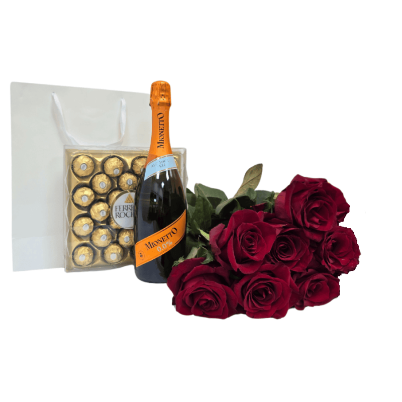 Saldainiai RAFFAELLO 230g Nealkocholinis gėrimas "Bosca" Rose 0.75l Popierinis dovanų maišelis 5vnt raudonų rožių