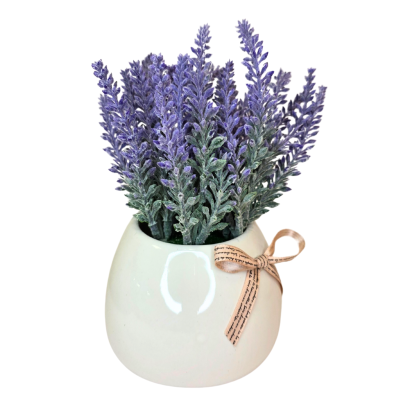 Stilinga dirbtinė levanda keraminio vazonėlio viduje – puikus pasirinkimas norint suteikti interjerui gaivumo ir jaukumo be papildomos priežiūros. Violetiniai levandos žiedai atrodo itin natūraliai.