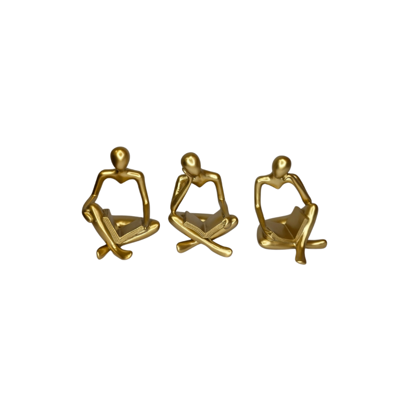 Modernios, minimalistinio stiliaus aukso spalvos statulėlės vaizduoja tris sėdinčius, knygas skaitančius personažus. Švelnios linijos ir elegantiškos proporcijos suteikia figūrėlėms išskirtinę estetiką, todėl jos puikiai tinka kaip subtilus interjero akcentas namuose ar darbo kabinete. Rinkinys harmoningai dera ant lentynų, komodų, knygų spintų ar darbo stalo.