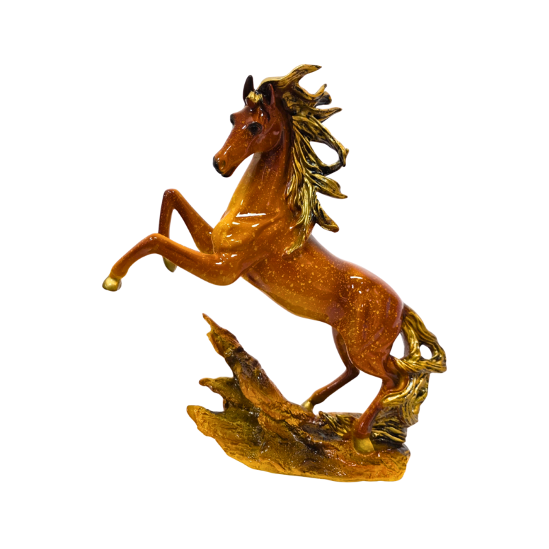 Įspūdinga dekoratyvinė žirgo statulėlė, išsiskirianti dinamiška poza ir ryškiu blizgiu paviršiumi. Rudos ir auksinės spalvos derinys suteikia kūriniui prabangos, o detalizuota karčų ir uodegos tekstūra pabrėžia žirgo judėjimo energiją. Ši statulėlė simbolizuoja laisvę, jėgą ir sėkmę, todėl puikiai tinka tiek namų interjerui, tiek kaip dėmesinga dovana.