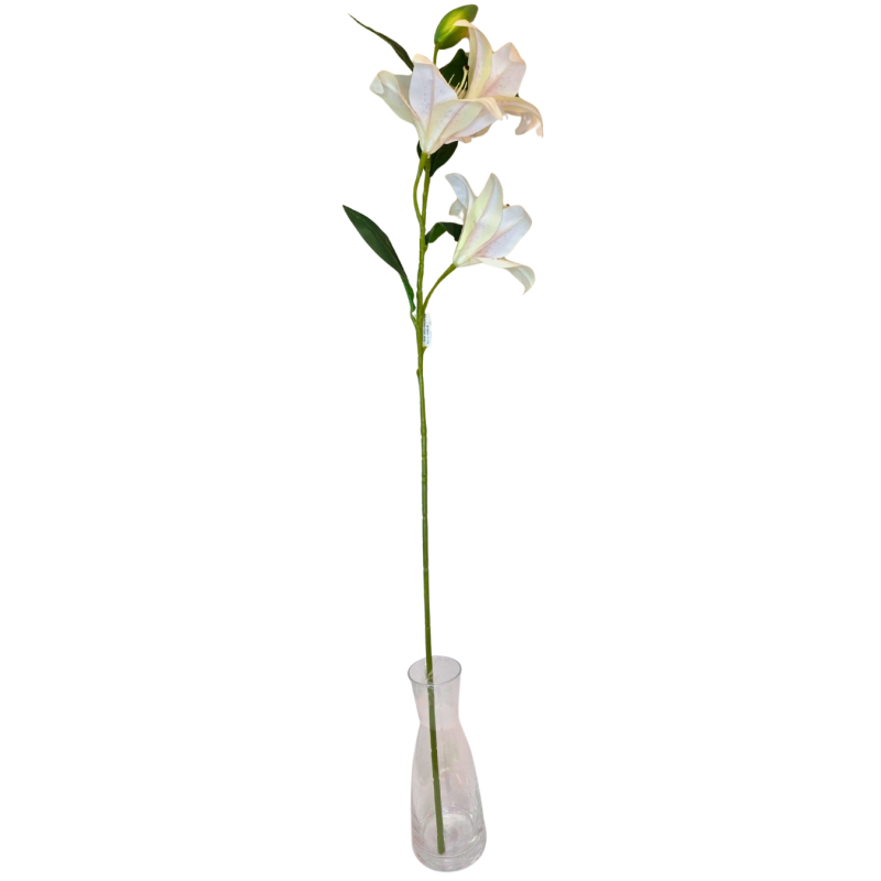Dirbtinė lelijos šakelė – elegantiška dekoratyvinė gėlė interjerui. Šviesūs, natūraliai atrodantys žiedai ir žalios spalvos lapai suteikia erdvei švaros, lengvumo ir subtilios prabangos pojūtį. Ilgas, tvirtas kotelis leidžia patogiai naudoti vazose, dekoratyvinėse kompozicijose ar derinti su kitomis dirbtinėmis gėlėmis. Puikiai tinka namų, biuro, švenčių ar vitrinų dekorui. Nereikalauja priežiūros, išlaiko estetinę išvaizdą visus metus.