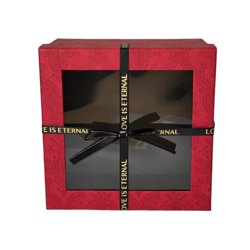 Prabangi dovanų dėžutė su langeliu ir juodu kaspinu – elegantiškas pasirinkimas ypatingai progai. Raudona dėžutės spalva su subtiliu ornamentu derinama su juodu kaspinu, puoštame auksiniu užrašu LOVE IS ETERNAL, kuris suteikia išskirtinumo ir prabangos pojūtį. Dėžutės langelis leidžia matyti viduje esančią dovaną.