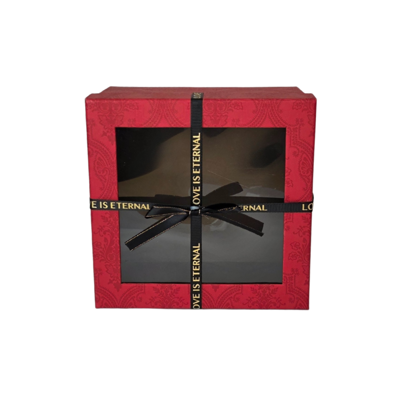 Prabangi dovanų dėžutė su langeliu ir juodu kaspinu – elegantiškas pasirinkimas ypatingai progai. Raudona dėžutės spalva su subtiliu ornamentu derinama su juodu kaspinu, puoštame auksiniu užrašu LOVE IS ETERNAL, kuris suteikia išskirtinumo ir prabangos pojūtį. Dėžutės langelis leidžia matyti viduje esančią dovaną.