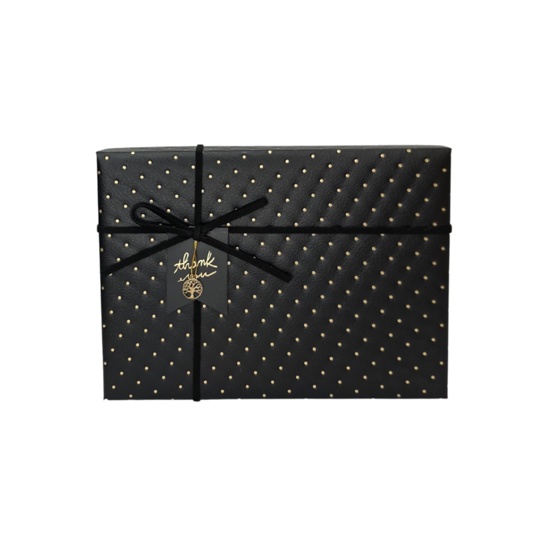 Elegantiška juoda dovanų dėžutė su subtiliais auksiniais taškeliais – klasikinis ir prabangus pasirinkimas dovanoms. Dėžutė puošta juodu kaspinu ir pakabuku su užrašu Thank you, suteikiančiu ypatingo dėmesio pojūtį. Tvirta konstrukcija ir kruopščiai apgalvotas dizainas paverčia ją puikia dovanos pakuote be papildomo įpakavimo.