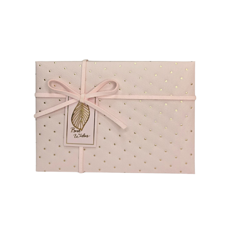 Švelniai rožinė spalva su auksiniais taškeliais suteikia prabangos ir subtilumo įspūdį, o kaspinėlis su dekoratyviniu lapeliu prideda išskirtinumo.