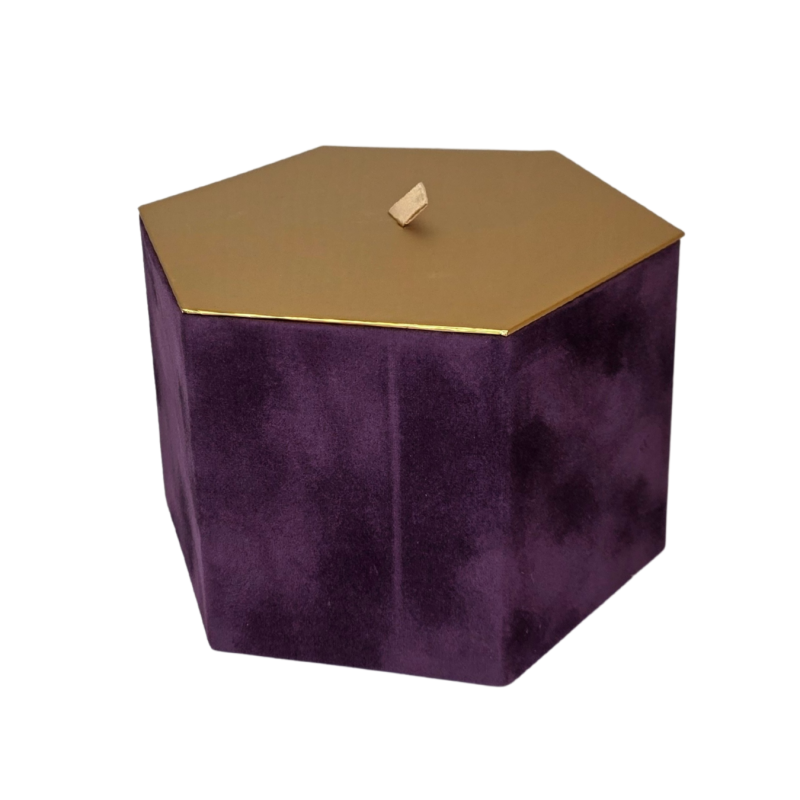 Prabangi šešiakampė dovanų dėžutė, pagaminta iš minkšto aksominio audinio, su auksiniu dangteliu ir rankenėle.