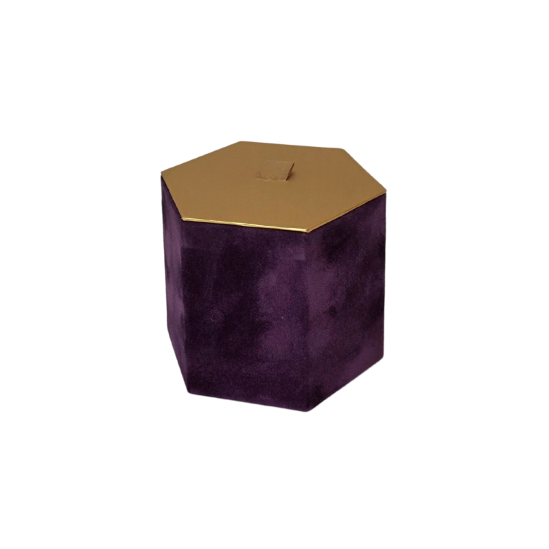 Prabangi šešiakampė dovanų dėžutė, pagaminta iš minkšto aksominio audinio, su auksiniu dangteliu ir rankenėle.