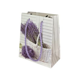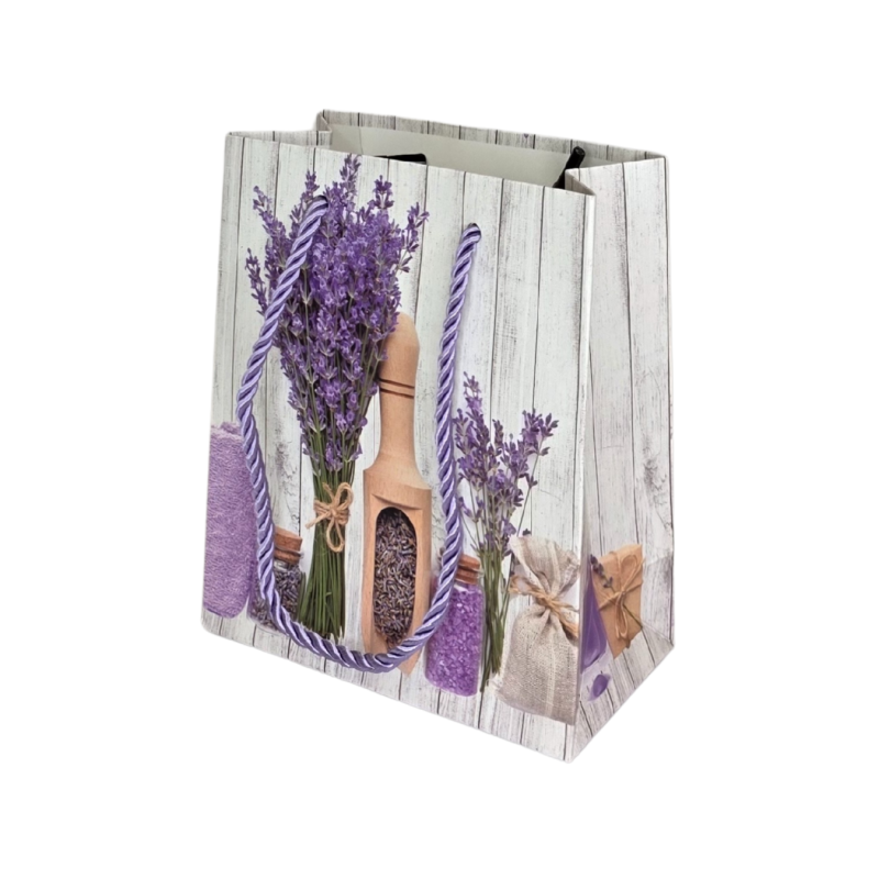 Išskirtinio grožio dovanų maišelis su levandų motyvu – subtilus, jaukus ir elegantiškas pasirinkimas bet kokiai progai. Švelnūs violetiniai atspalviai ir natūralaus medžio ar pintų krepšelių fonai kurie spinduliuoja ramybę ir natūralų grožį. Puikiai tinka dovanoms gimtadieniams, šventėms ar padėkos progoms. Pagamintas iš tvirto popieriaus su dekoratyvinėmis virvelinėmis rankenomis.