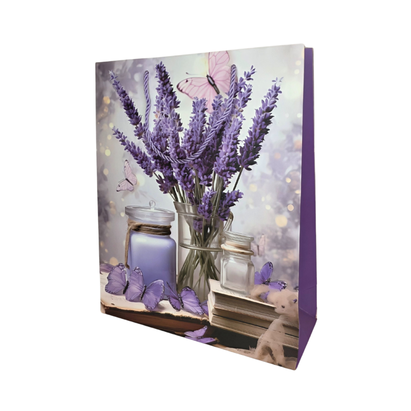 Išskirtinio grožio dovanų maišelis su levandų ir drugelių dizainu. Ant švelnaus, pasakiško fono pavaizduotos stiklinės vazelės su levandų puokšte, knygomis ir dekoratyvinėmis žvakėmis. Puikiai tinka švelnioms, romantiškoms dovanoms – gimtadieniams, moterų šventėms ar padėkos progoms.