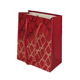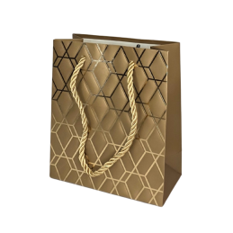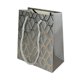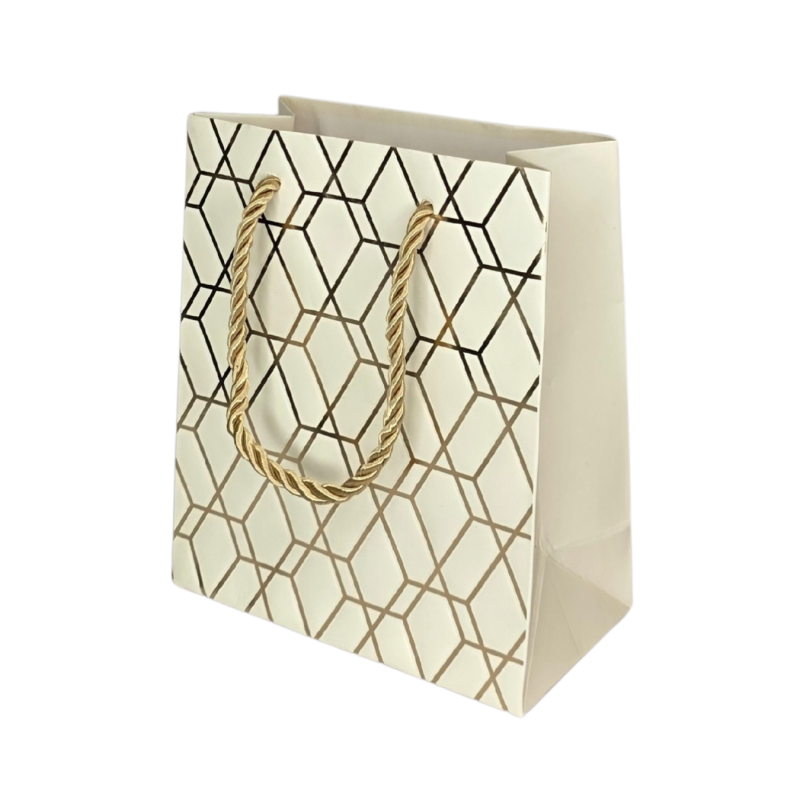 Prabangus ir stilingas dovanų maišelis su geometriniu raštu ir subtiliu blizgesiu. Klasikinės spalvos bei aukso tonų detalės suteikia elegancijos ir modernumo – puikus pasirinkimas dovanoms įvairioms progoms: gimtadieniams, jubiliejams, vestuvėms ar verslo dovanoms. Pagamintas iš tvirto, kokybiško popieriaus, su patogiomis virvelinėmis rankenomis.