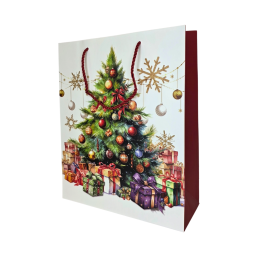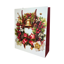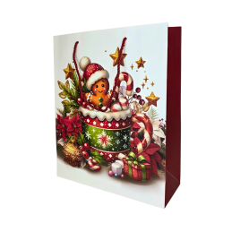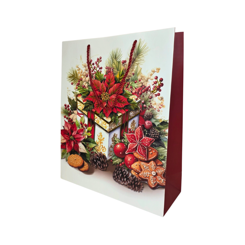 Šventiniai raudoni dovanų maišeliai su įvairiais kalėdiniais piešiniais – eglute, dovanomis, vainiku ir imbieriniu sausainiu. Kiekvienas maišelis dekoruotas ryškiomis spalvomis ir šventinėmis detalėmis, kurios suteikia dovanai jaukumo bei išskirtinumo. Pagaminti iš tvirto, blizgaus popieriaus, su raudonomis virvelinėmis rankenomis.