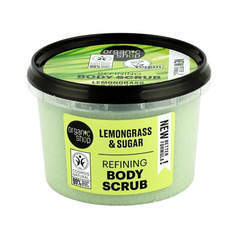 Organic Shop Lemongrass & Sugar kūno šveitiklis – natūralus kūno priežiūros produktas, skirtas odos atnaujinimui ir glotninimui.