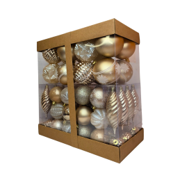 Kalėdiniai eglutės žaisliukai – elegantiškas ir prabangus rinkinys, kuriame subtiliai dera aukso atspalviai. Skirtingų formų ir paviršių burbulai – matiniai, blizgūs, blizgučiais dengti ir raštuoti – suteikia eglutei išskirtinio žavesio bei rafinuotos šventinės nuotaikos. Tai puikus pasirinkimas tiems, kurie mėgsta švelnų, šviesų ir klasikinį kalėdinį dekorą.