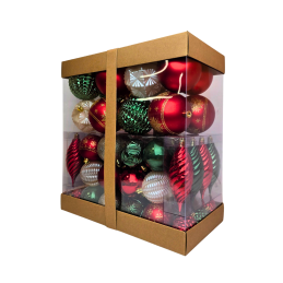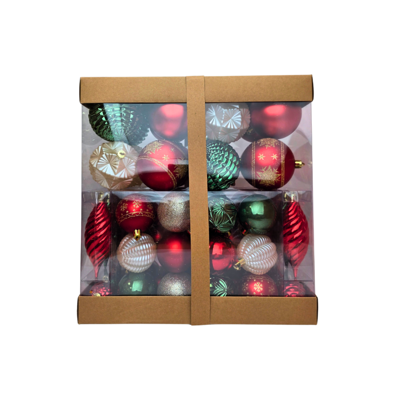 Kalėdiniai eglutės žaisliukai – tai prabangus ir klasikinis rinkinys, kuriame derinamos tradicinės raudonos, žalios, ir šviesiai pilkos spalvos. Įvairių formų ir paviršių burbulai – blizgūs, matiniai, blizgučiais dengti bei raštuoti – suteikia eglutei išskirtinio grožio, žaismingumo ir šventinės prabangos. Puikiai tinka tiek klasikiniam, tiek moderniam Kalėdų dekorui.