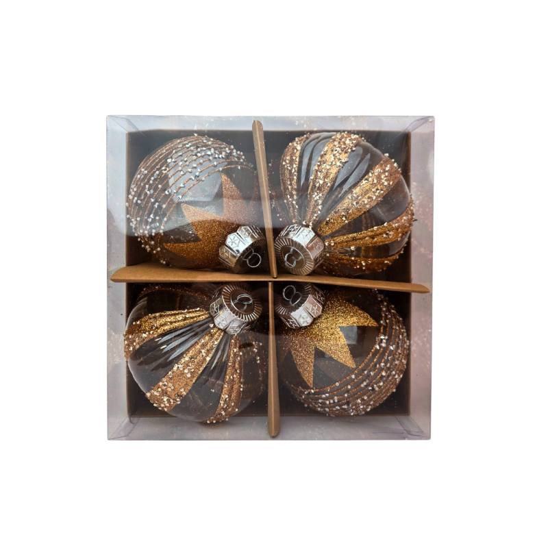 Kalėdiniai eglutės žaisliukai – prabangos ir elegancijos derinys jūsų šventinei dekoracijai. Kiekvienas burbulas puoštas auksiniais blizgučiais, perlais ir subtiliais raštais, kurie gražiai atspindi šviesą ir suteikia eglutei išskirtinio spindesio. Šie žaisliukai puikiai dera su klasikinėmis ir moderniomis kalėdinėmis puošmenomis. Supakuoti dailioje dėžutėje – puikiai tinka dovanai ar stilingam šventiniam interjerui.