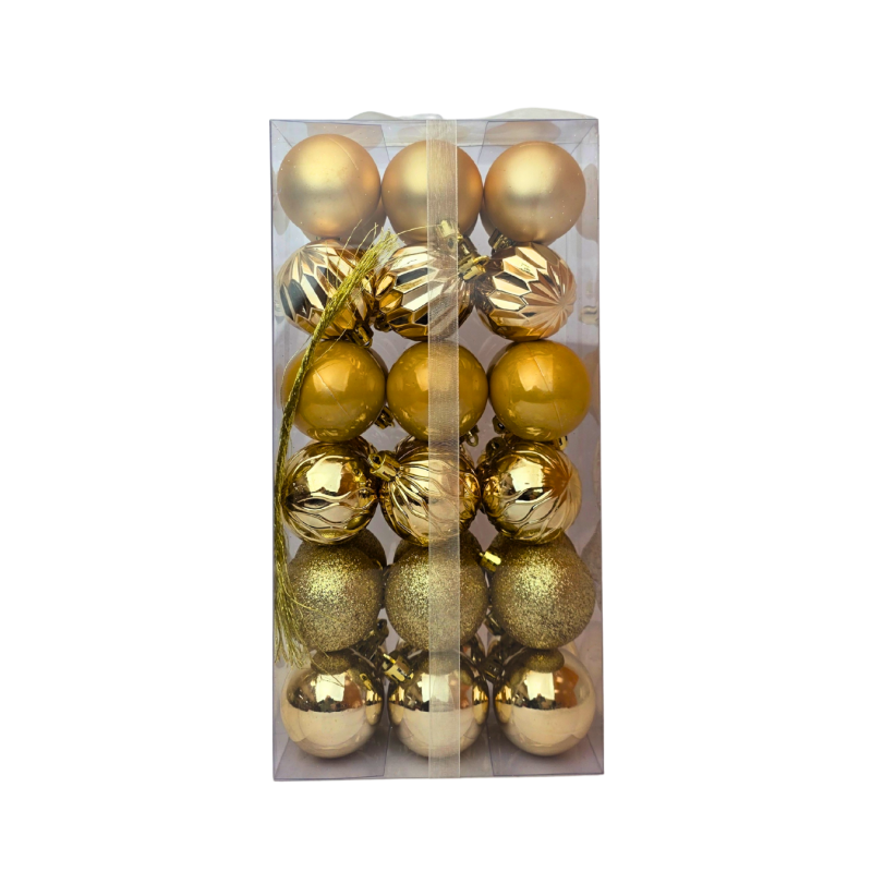 Kalėdiniai eglutės žaisliukai – prabanga alsuojantis aukso spalvos rinkinys, sukuriantis šiltą ir šventišką atmosferą Jūsų namuose. Rinkinyje derinami matiniai, blizgūs, blizgučiais dengti ir raštuoti burbulai, kurie suteikia eglutei išskirtinio žavesio bei spindesio.