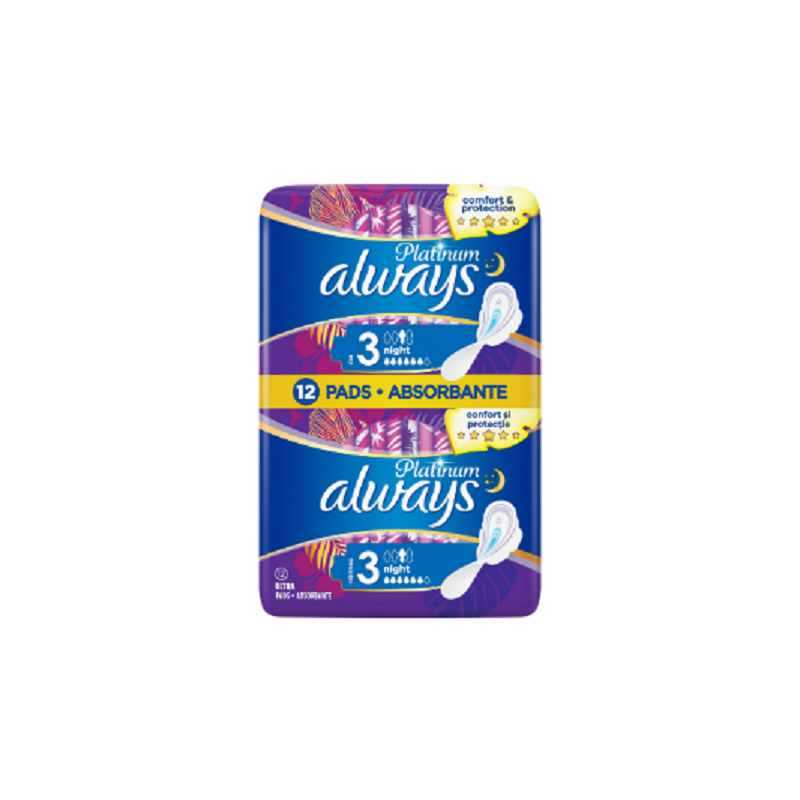 „Always Platinum Night“ (3 dydis) paketai siūlo geriausią komforto ir apsaugos derinį „Always“ asortimente, specialiai pritaikytą naktiniam naudojimui arba gausioms dienos metu. Šie paketai pasižymi išskirtiniu švelnumu, dvigubais šoniniais barjerais ir yra sukurti taip, kad suteiktų ramų miegą ir užtikrintą apsaugą, neprilygstamą komfortą jautriai odai.