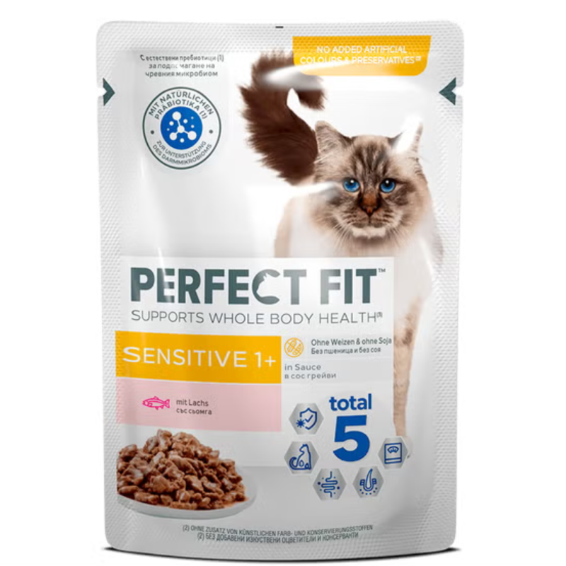 PRITAIKYTA SUAUGUSIAI KATEI, TURINČIAI JAUTRŲ VIRŠKINIMĄ Be unikalios „Perfect Fit Total 5“ formulės, kuri būdinga visiems „Perfect Fit“ gaminims, mūsų „Sensitive 1+“ produktas sveikatai teikia papildomos naudos, atitinkančios specifinius suaugusios katės, turinčios jautrią virškinimo sistemą, poreikius. Jame nėra sojos ir kviečių, todėl virškinimas netrikdomas, o papildomi probiotikai skatina žarnyno florą.