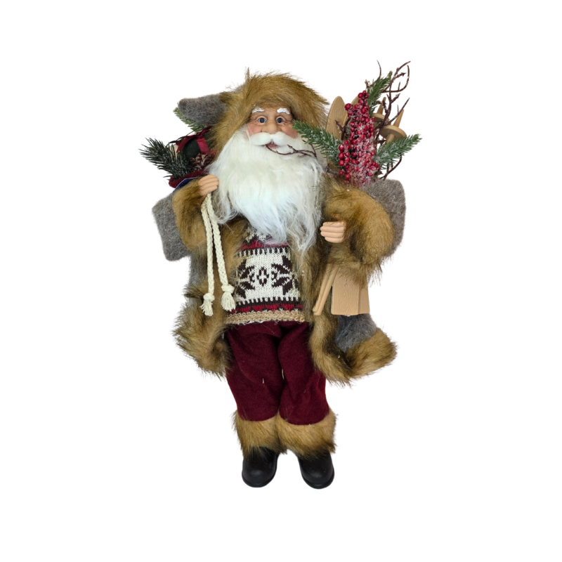 Kalėdų senelis – išskirtinio dizaino šventinė figūrėlė, sukurianti jaukią ir autentišką Kalėdų atmosferą. Senelis apsirengęs šiltu kailinuku, raštuotu megztiniu ir bordo spalvos kelnėmis, rankose laiko kalėdines šakeles su uogomis bei slides. Detalus rankų darbas ir kruopščiai parinktos medžiagos suteikia jam natūralumo ir kokybės pojūtį. Puikiai tinka kaip kalėdinės dekoracijos akcentas ant lentynos, po eglute ar prie židinio.