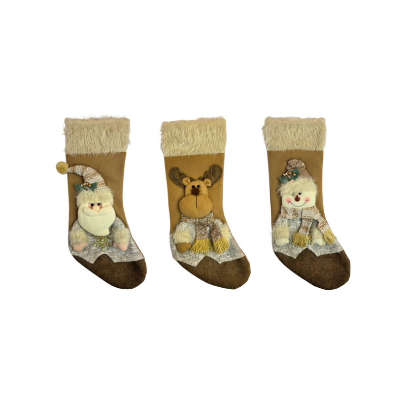 Kalėdinės kojinės su žaismingais personažais – puikus būdas papuošti namus ir sukurti jaukią šventinę atmosferą. Rinkinyje yra trys skirtingi dizainai: Kalėdų Senelis, elnias ir besmegenis. Kojinės puoštos švelniu kailiuku viršuje, dekoruotos minkštais audiniais ir smulkiomis detalėmis, kurios suteikia išskirtinumo ir šilumos pojūtį. Puikiai tinka dovanėlėms, saldumynams ar Kalėdų dekoracijai.