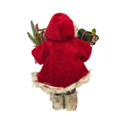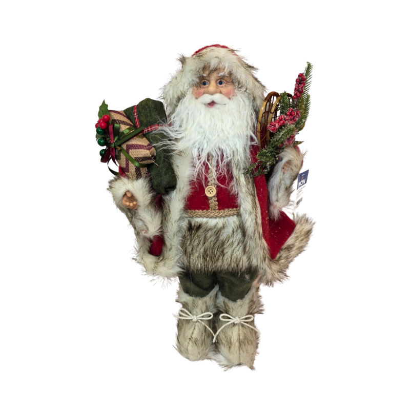 Kalėdų senelis – tradicinio stiliaus šventinė figūrėlė, spinduliuojanti šiluma ir Kalėdų dvasia. Apsirengęs raudonu paltu su kailiniais apsiuvais ir šiltomis žaliomis kelnėmis, senelis atrodo tarsi iš pasakos. Rankose jis laiko dovanų ryšulėlį bei dekoratyvines šakeles su uogomis ir mažomis rogutėmis – viskas apgalvota iki smulkiausių detalių. Ilga balta barzda, švelnus veido išraiškos modeliavimas ir kruopščiai pasiūtos drabužių detalės suteikia jam tikroviškumo ir jaukumo. Puikiai papuoš jūsų namus šventiniu laikotarpiu.