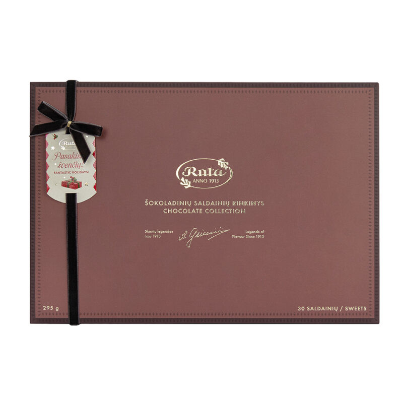 Sudedamosios dalys: šokoladas 29 % (kakavos masė, cukrus, kakavos sviestas, emulsiklis SOJŲ lecitinas, natūrali vanilės kvapioji medžiaga), pieninis šokoladas 27 % (cukrus, kakavos sviestas, nenugriebto PIENO milteliai, kakavos masė, IŠRŪGŲ milteliai, PIENO riebalai, emulsikliai (SOJŲ lecitinas, poliglicerolio poliricinoleatas), kvapioji medžiaga vanilinas), baltasis šokoladas 8 % (cukrus, kakavos sviestas, nenugriebto PIENO milteliai, emulsiklis SOJŲ lecitinas, vanilės ekstraktas), LAZDYNO RIEŠUTŲ įdaras 5,4 % (LAZDYNO RIEŠUTAI (50 %), cukrus, emulsiklis SOJŲ lecitinas), gliukozės sirupas, cukrus, kakavos sviestas, plakamoji GRIETINĖLĖ (GRIETINĖLĖ (iš PIENO), PIENO baltymai, stabilizatorius karageninas), razinų su romo aromatu įdaras 2,6 % (razinos (45 %), cukrus, tirštiklis modifikuotas krakmolas, rūgštingumą reguliuojanti medžiaga citrinų rūgštis, romo kvapioji medžiaga, konservantas kalio sorbatas), Ruby šokoladas 1,7 % (cukrus, kakavos sviestas, nenugriebto PIENO milteliai, kakavos masė, emulsiklis SOJŲ lecitinas, rūgštis (citrinų rūgštis), natūrali vanilės kvapioji medžiaga), marcipanas 1,6 % (MIGDOLAI (52 %), cukrus, invertuotojo cukraus sirupas, vanduo, alkoholis, stabilizatorius invertazė), SVIESTAS, brendis, augaliniai riebalai (palmių, palmių branduolių), dribsniai (KVIETINIAI miltai, cukrus, augaliniai riebalai (rapsų), PIENO riebalai, PIENO cukrus, PIENO baltymai, druska, salyklo ekstraktas (MIEŽIŲ), emulsiklis lecitinas, tešlos kildymo medžiaga natrio rūgštusis karbonatas), saldintas sutirštintas PIENAS (PIENAS (55 %), cukrus (45 %)), LAZDYNŲ RIEŠUTAI (0,6 %), kvapiųjų mandarinų tyrė (0,6 %), maskarponės pasta 0,6 % (maskarponės SŪRIS 50 % (GRIETINĖLĖ, rūgštingumą reguliuojanti medžiaga citrinų rūgštis), cukrus, nenugriebtas PIENAS, KIAUŠINIŲ tryniai, etilo alkoholis, kvapioji medžiaga), smulkintos kakavos pupelės (0,5 %), aviečių uogos (0,3 %), kakavos masė, kavos skonio ir kvapo desertinė pasta Mocca 0,2 % (cukrus, karamelė, skrudinta kava (12 %), modifikuotas krakmolas E 1422, brendis, etilo alkoholis), etilo alkoholis, liesi kakavos milteliai, PISTACIJOS (0,05 %), emulsiklis SOJŲ lecitinas, dygminų koncentratas, citrinų koncentratas, joduotoji druska, kvapiosios medžiagos, maltodekstrinas, tapijokų krakmolas, stabilizatorius invertazė, rūgštingumą reguliuojanti medžiaga natrio karbonatas, spirulinos koncentratas. SKAIDULINIŲ MEDŽIAGŲ ŠALTINIS. Šokolade kakavos sausųjų medžiagų – ne mažiau kaip 55 %. Pieniniame šokolade kakavos sausųjų medžiagų – ne mažiau kaip 32,1 %, PIENO sausųjų medžiagų – ne mažiau kaip 14,7 %. Ruby šokolade kakavos sausųjų medžiagų – ne mažiau kaip 41,8 %