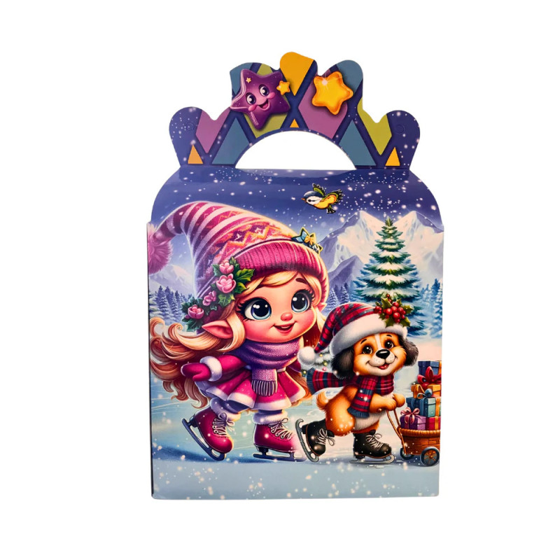 Rinkinį sudaro: Batonėlis 1vnt, sausainiai 1vnt, kramtomoji guma 5vnt, kramtomieji saldainiai 1vnt, saldainiai 4vnt, ledinukas 1vnt, saldainis skystas 2vnt, šokoladiniai saldainiai 44 g, kramtomieji saldainiai Asorti 100g.