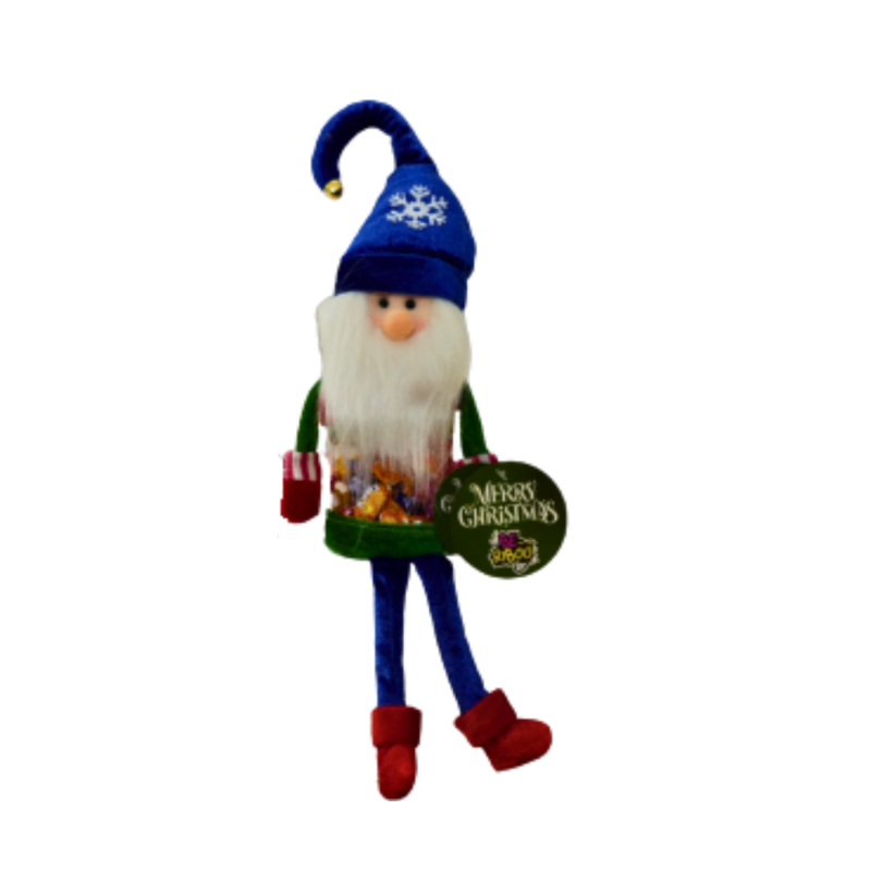 Žaismingas kalėdinis nykštukas su ilga balta barzda, ryškia mėlyna kepure ir minkštomis dekoratyvinėmis galūnėmis. Skaidri jo dėžutė ne tik pripildyta saldainių, bet vėliau gali būti naudojama kaip taupyklė, todėl tai dviguba ir praktiška dovana. Puikiai tinka vaikams, šventinėms staigmenoms ar jaukioms Kalėdų dekoracijoms.