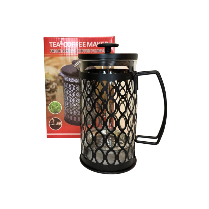Modernus ir stilingas kavinukas / arbatinukas su dekoratyviniu juodo metalo ornamentuotu rėmeliu. Pagamintas iš karščiui atsparaus stiklo ir tvirto metalo, šis indas ne tik išsiskiria elegantišku dizainu, bet ir užtikrina patogų bei kokybišką kavos ar arbatos ruošimą. Nerūdijančio plieno filtras leidžia išgauti intensyvų, aromatingą gėrimo skonį.