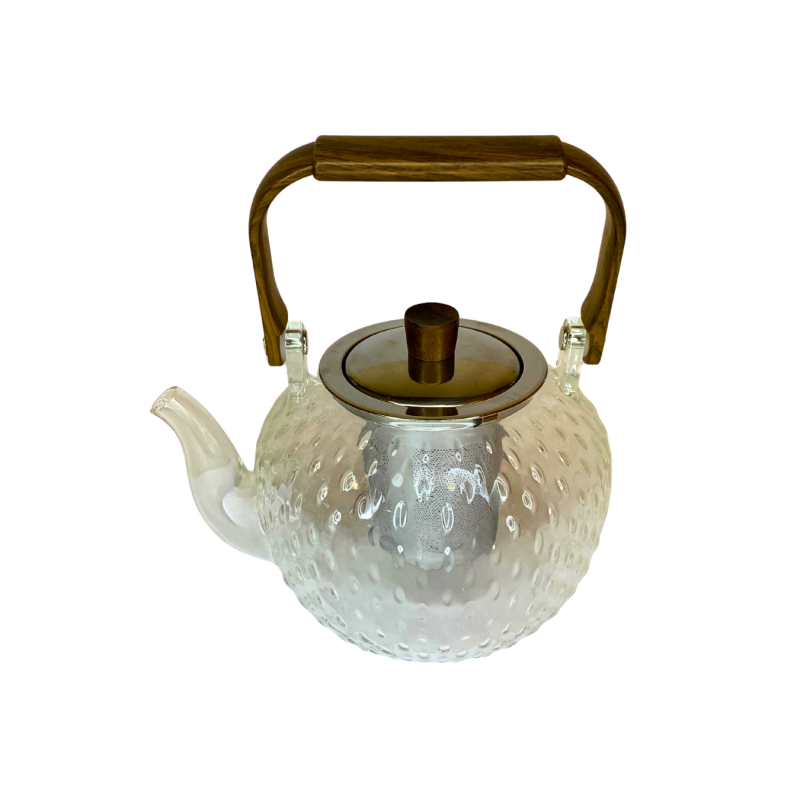 Elegantiškas stiklinis arbatinukas su integruotu metaliniu sieteliu, skirtas birioms arbatoms ar žolelėms. Skaidrus korpusas leidžia stebėti arbatos skleidimąsi, o patogi medinė rankena suteikia saugų ir komfortišką naudojimą.