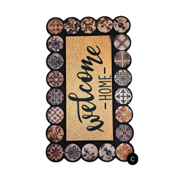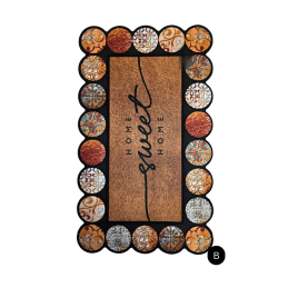 Stilingi ir praktiški durų kilimėliai, papuošti dekoratyvinių apskritimų rėmeliu ir ryškiais užrašais centre. Pagaminti iš tvirtos, neslidžios medžiagos, puikiai tinka tiek vidaus, tiek lauko naudojimui po stogeliu.