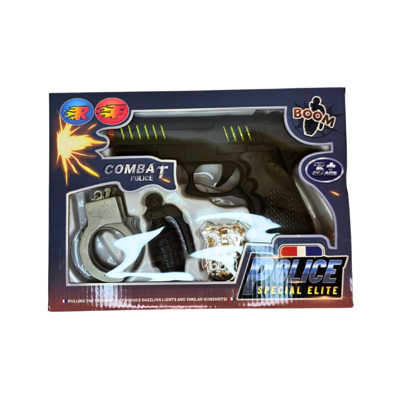 · Rinkinyje: žaislinis pistoletas, antrankiai, granata, policijos ženklelis