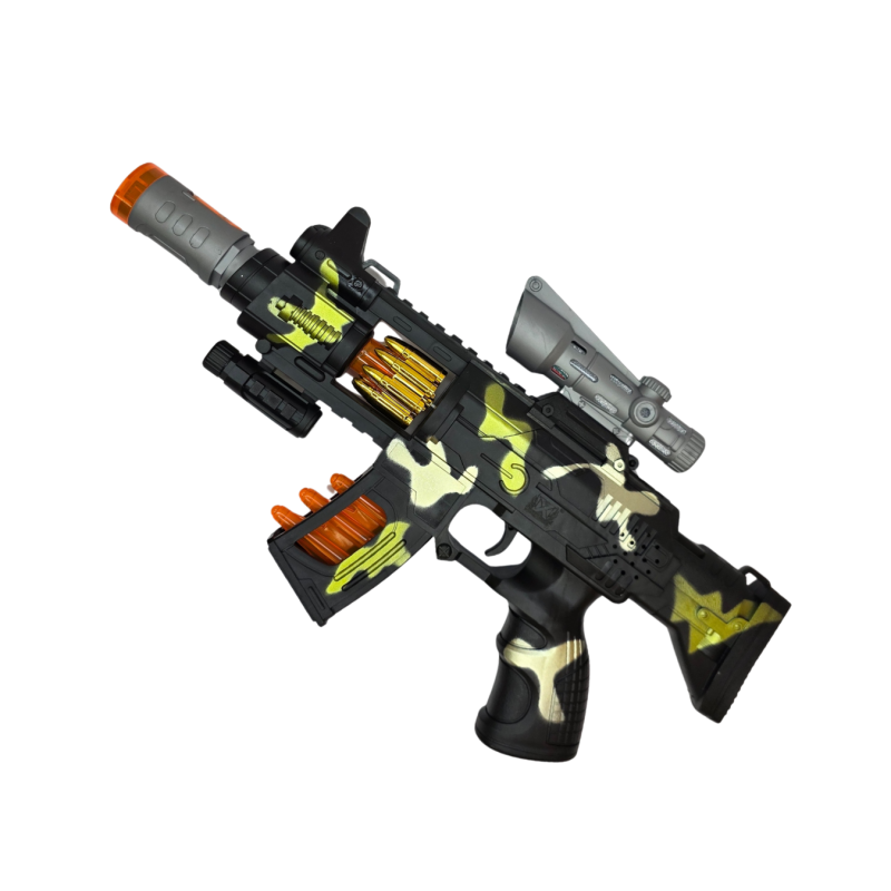 Realistiško dizaino žaislinis automatinis šautuvas su šviesos ir garso efektais – puikus pasirinkimas vaikams, mėgstantiems veiksmo žaidimus! Nuspaudus gaiduką, šautuvas šviečia, skleidžia šaudymo garsus, o imitacinės kulkos sukasi, suteikdamos dar daugiau žaidimo įspūdžio.
