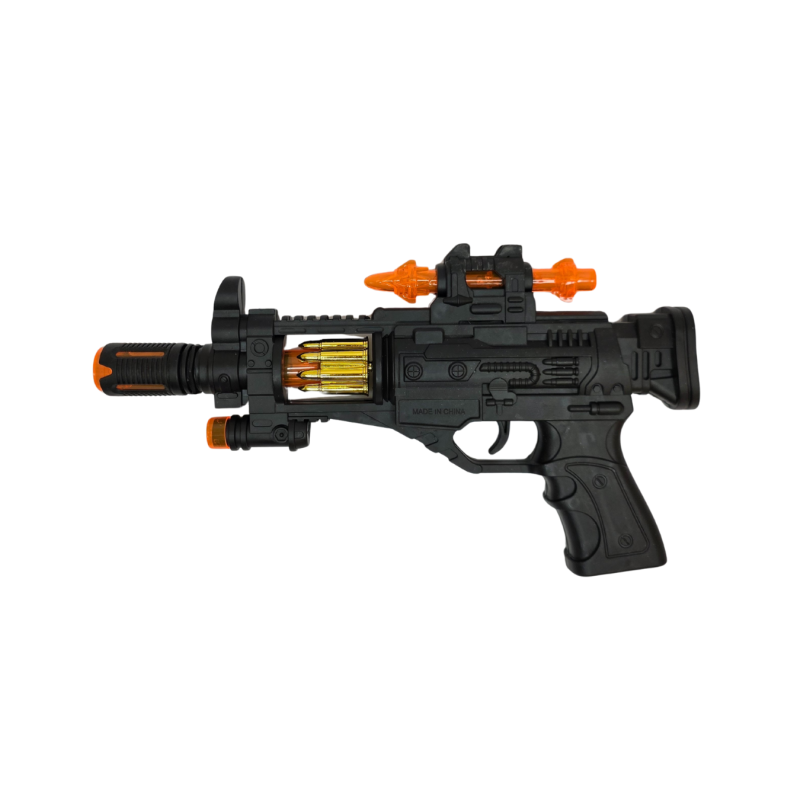 Realistiško dizaino žaislinis automatinis šautuvas su šviesos ir garso efektais – puikus pasirinkimas mažiesiems kariams! Nuspaudus gaiduką, šautuvas šviečia, skleidžia šaudymo garsus ir sukasi imitacinės kulkos, suteikdamos dar daugiau veiksmo žaidimui.