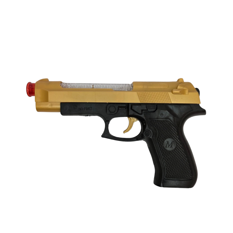 Klasikinio stiliaus žaislinis pistoletas su šviesos ir garso efektais suteiks mažiesiems daugybę linksmybių ir veiksmo žaidimų pramogų! Nuspaudus gaiduką, pistoletas šviečia ir skleidžia šaudymo garsus.