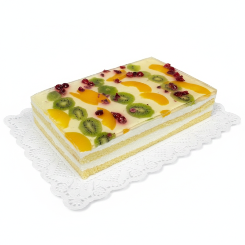 Lengvas vaisinis pyragas su puriu biskvitu, švelniu kremu ir gaiviu vaisių sluoksniu