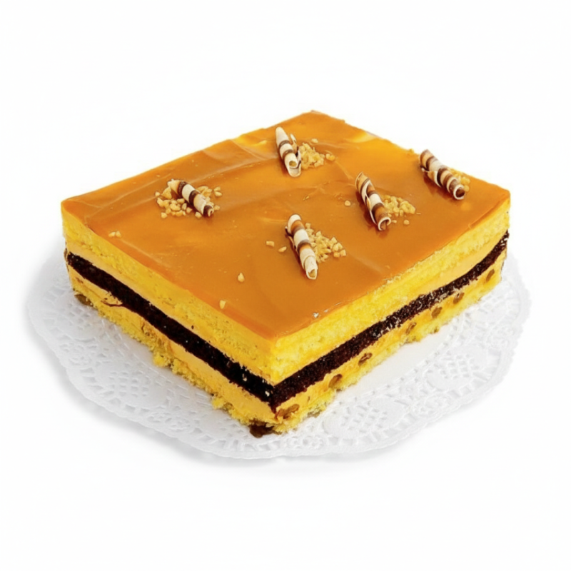 GRIETINĖLĖ 30% (GRIETINĖLĖ), karamelizuotas saldintas sutirštintas pienas (Pieno riebalų 8%, sausųjų neriebalinių pieno medžiagų 20%. PIENAS 55%, cukrus 45%)), KIAUŠINIŲ masė, karamelės skonio įdaras (cukrus, vanduo, fruktozės-gliukozės sirupas (KVIEČIŲ), pakeistų savybių kukurūzų krakmolas, dalinai hidrintas palmių aliejus (emulsikliai: E322 (SOJŲ), E492), dažikliai: E150a, E171, E160c, stabilizatoriai: E418, E466, rūgštingumą reguliuojanti medžiaga E333, karamelės kvapioji medžiaga, druska, emulsiklis E471, antioksidatorius E223)), mišinys pyrago šokolado skonio (cukrus, KVIETINIAI miltai, mažesnio riebumo kakavos milteliai, modifikuotas krakmolas, kakavos skaidulinės medžiagos, tešlos kildymo medžiagos: (E450, E500), valgomoji druska, emulsikliai: (E475; E471; E481)), PIENO skonio mišinys kremų gamybai (cukrus, PIENO MILTELIAI, augalinis aliejus (palmių), gliukozės sirupas, SAUSOS IŠRŪGOS, augaliniai riebalai (visiškai hidrinti kokosų), tirštiklis (E401), emusiklis (E472a), kvapioji medžiaga)), rafinuotas, dezodoruotas rapsų aliejus, KVIETINIAI miltai, vanduo, cristaline skaidri želė: (gliukozės sirupas, vanduo ,cukrus, tištikliai, agaras, pektinas, rūgštingumą reguliuojančios medžiagos citrinų rūgštis, dinatrio difofatai, stabilizatorius glicerolis, konservantas kalio sorbatas)), citrina), SVIESTO skonio mišinys pyragų gamybai (bulvių krakmolas, ryžių miltai, cukrus, tešlos kildymo medžiagos (E450, E500, E341) stabilizatoriai (E466, E515), druska, emusiklis (E481), kvapioji medžiaga, dažiklis (E160a), rūgštis (E330)), cukrus, ŽEMĖS RIEŠUTAI kapoti, maistinė želatina, juodojo šokolado drožlės (cukrus, kakavos masė, mažo riebumo kakavos milteliai, kakavos sviestas, emusiklis SOJŲ lecitinas E322)).