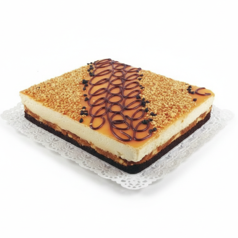 GRIETINĖLĖ 36%, šokolado sk. mišinys pyragui (cukrus, KVIETINIAI MILTAI, sumažinto riebumo kakavos milteliai, modifikuotas krakmolas, kakavos skaidulinės medžiagos, kvapiosios medžiagos, tešlos kildymo medžiagos(E450, E500), druska, emulsikliai: E475, E471, E481), karamelės skonio mišinys kremų gamybai (cukrus, gliukozė, karamelizuotas cukrus, modifikuotas bulvių krakmolas (E1414), gliukozės sirupas, PIENO MILTELIAI, tirštiklis (E401), augaliniai riebalai (palmių ir visiškai hidrinti kokosų, skirtingomis porcijomis), druska, kvapioji medžiaga, dažiklis (E150c), emusiklis, (E472a), KVIEČIŲ GLITIMAS), karamelės skonio įdaras su jūros druska (vanduo, cukrus, gliukozės-fruktozės sirupas, drėgmę išlaikanti medžiaga E422, palmių aliejus, nugriebto PIENO MILTELIAI, modifikuotas krakmolas, stabilizatoriai: celiuliozė ir E466, jūros druska (1%), karamelės cukraus sirupas, kvapiosios medžiagos, dažikliai E171, E160b ir E120, konservantas E202, emulsiklis E435), KIAUŠINIŲ MASĖ (pasterizuota KIAUŠINIŲ MASĖ), ŽEMĖS RIEŠUTAI, SVIESTAS 82%, rapsų aliejus rafinuotas, cukrus, paruošta naudoti skaidri želė (gliukozės sirupas, vanduo, cukrus, tirštikliai: agaras, pektinas, rūgštingumą reguliuojanti medžiaga citrinų rūgštis, dinatrio difosfatai, stabilizatorius glicerolis, konservantas kalio sorbatas), KVIETINIAI MILTAI, ŽEMĖS RIEŠUTŲ trupinai, mišinys sausainių ir trupinių gamybai (avižų sėlenos, augalinis aliejus (palmių), KVIEČIŲ KRAKMOLAS, sausos IŠRŪGOS, KVIETINIAI MILTAI, gliukozės sirupas, tešlos kildymo medžiagos E450, E500, manų kruopos (KVIEČIŲ), modifikuotas bulvių krakmolas E1412, ryžių miltai, kvapiosios medžiagos, tirštiklis E401, emulsikliai E472b, E477, druska, pieno milteliai), kakavos įdaras (vanduo, cukrus, gliukozės sirupas, modifikuotas krakmolas, rafinuoti palmių riebalai, 2,5% sumažinto riebumo kakavos milteliai, tirštiklis celiuliozė, kvapioji medžiaga, druska, rūgštis (vyno rūgštis(L(+)-)), konservantas (kalio sorbatas), dažiklis (titano dioksidas), emulsiklis (polisorbatas 60)), želatina, belgiško šokolado papuošimai (kakavos masė (49,5%), cukrus (49,5%), emulsiklis SOJŲ lecitinas E322(<1%), natūrali vanilės kvapioji medžiaga(<1%).