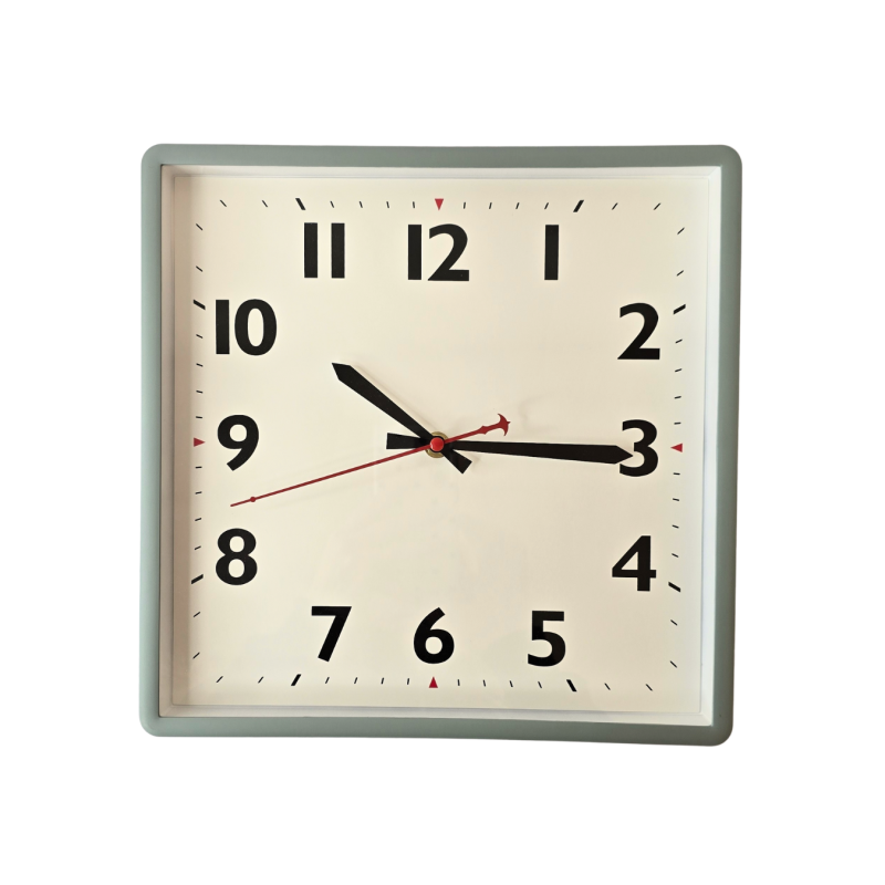 Stilingas, minimalistinio dizaino pakabinamas laikrodis su subtilia pasteline pilkai žalsva spalva. Laikrodis yra kvadratinės formos, puikiai dera prie modernaus ar skandinaviško interjero.