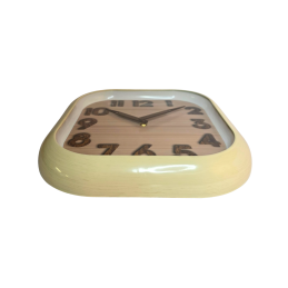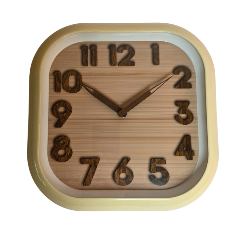 Klasikinio dizaino sieninis laikrodis su medžio rašto ciferblatu ir tamsaus medžio spalvos detalėmis. Šviesus rėmelis suteikia subtilumo ir šilumos pojūtį, todėl šis laikrodis puikiai dera prie įvairių interjero stilių – nuo modernaus iki kaimiško.