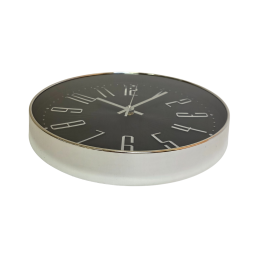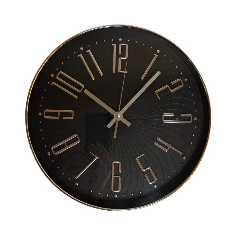 Elegantiškas juodos spalvos sieninis laikrodis su subtiliu banguotu fonu ir sidabrinėmis detalėmis. Modernus dizainas ir aiškūs skaičiai suteikia laikrodžiui prabangos įspūdį – puikiai tiks tiek biurui, tiek stilingam namų interjerui.