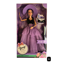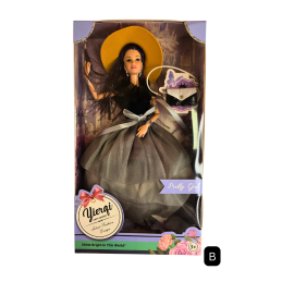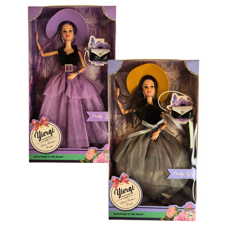 Elegantiška lėlė su puria sluoksniuota suknele, didele madinga skrybėle ir rankine. Tinka žaidimams, kolekcijai ar dovanai.
