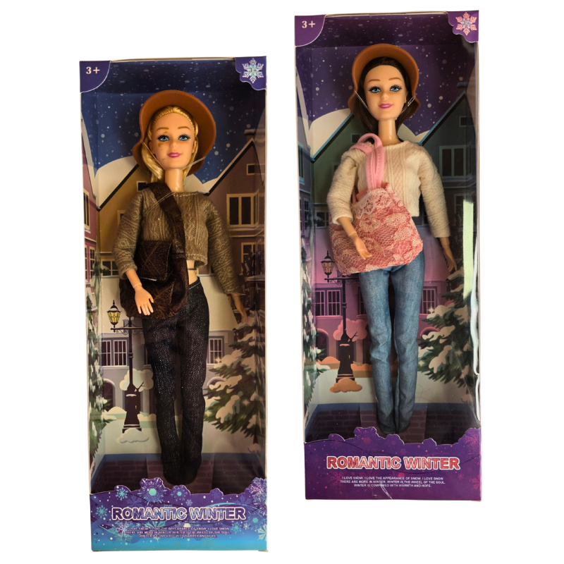 Stilinga lėlė su žiemine apranga ir rankine. Puikiai tinka kūrybiniams vaidmenų žaidimams.