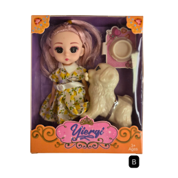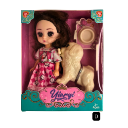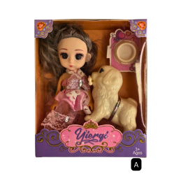 Žavinga lėlė su savo augintiniu šuniuku – puikus žaidimo rinkinys mažiesiems. Lėlė vilki gražią suknelę, o šuniukas turi pavadėlį. Rinkinyje taip pat yra maisto dubenėlis.