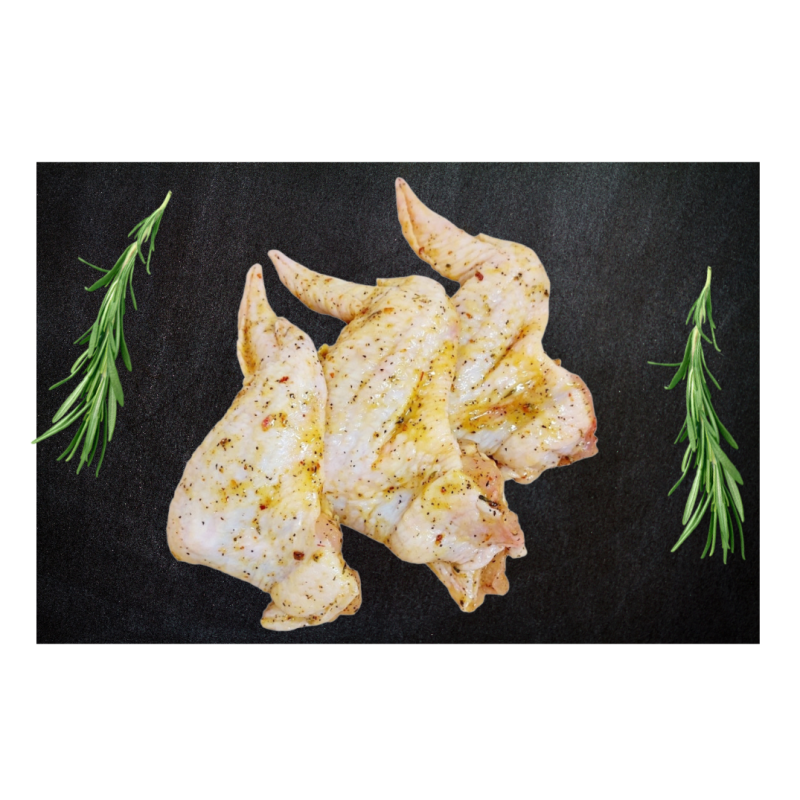 SUDEDAMOSIOS DALYS: viščiukų broilerių sparneliai 94%, marinolis "Lemon-Pfeffer" - halal (Augalinis aliejus (rapsų), augaliniai riebalai (rapsų, Sal. (šorėjų) sviestas įvairiomis dalimis), jūros druska, prieskoniai (pipirai, svogūnai, paprikos, ciberžolė), cukrus, natūralios kvapiosios medžiagos, čiobreliai.