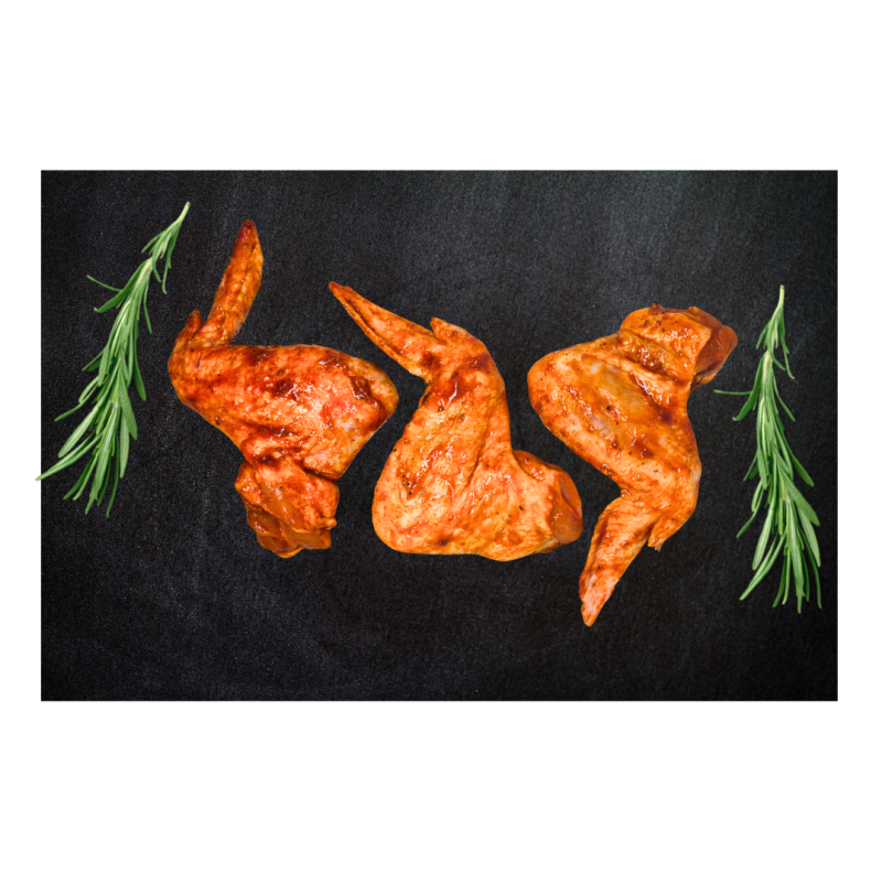 viščiukų broilerių sparneliai, marinolis "Grillbutter" (Augalinis aliejus (rapsų), augaliniai riebalai (iš dalies hidrinti palmių, visiškai hidrinti rapsų (0,7-3,0%)), joduota valgomoji druska (18,2%), prieskoniai (karis, svogūnai, muskatas ir kt.), cukrus (3%), kvapiosios medžiagos, gliukozės sirupas, mielių ekstraktas, dekstrozė (2%), prieskoniniai augalai (petražolės, porai)).